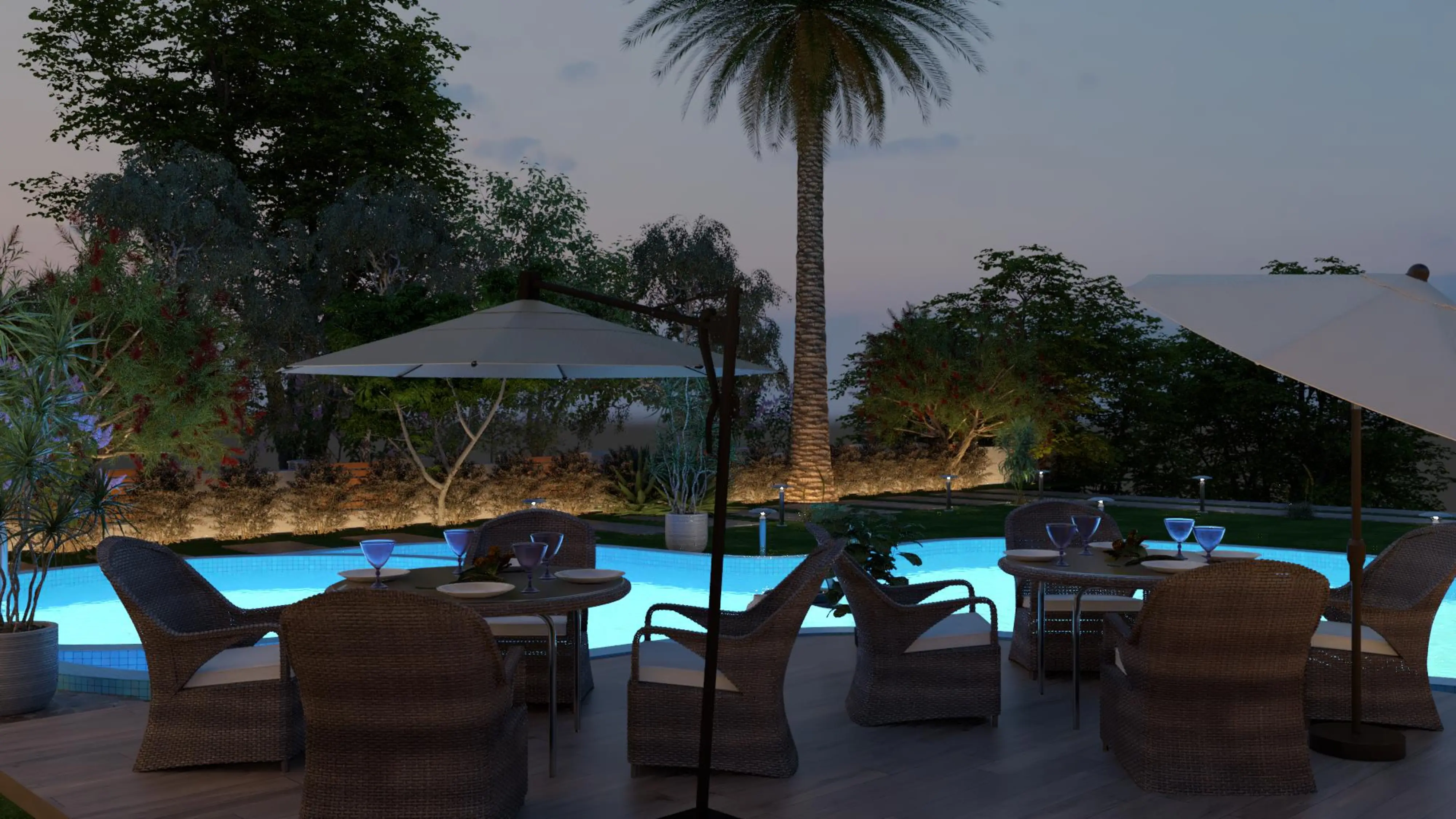 The seating area near the swimming pool and clubhouse is designed for relaxation, providing comfortable arrangements and a peaceful ambiance to enjoy with family and friends.